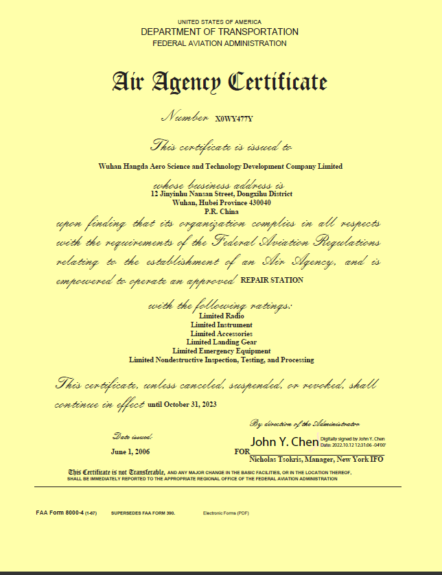 200110月    公司獲中國民航總局授權(quán)的民航維修許可證。